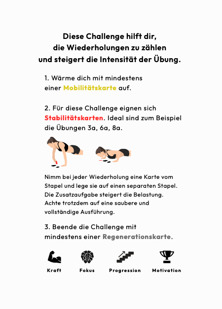 Unsere Karten motivieren dich, geben deinem Training Struktur und eine tägliche Routine. Erlebe Abwechslung und Trainingsfortschritt ohne App, Abo und Geräte.