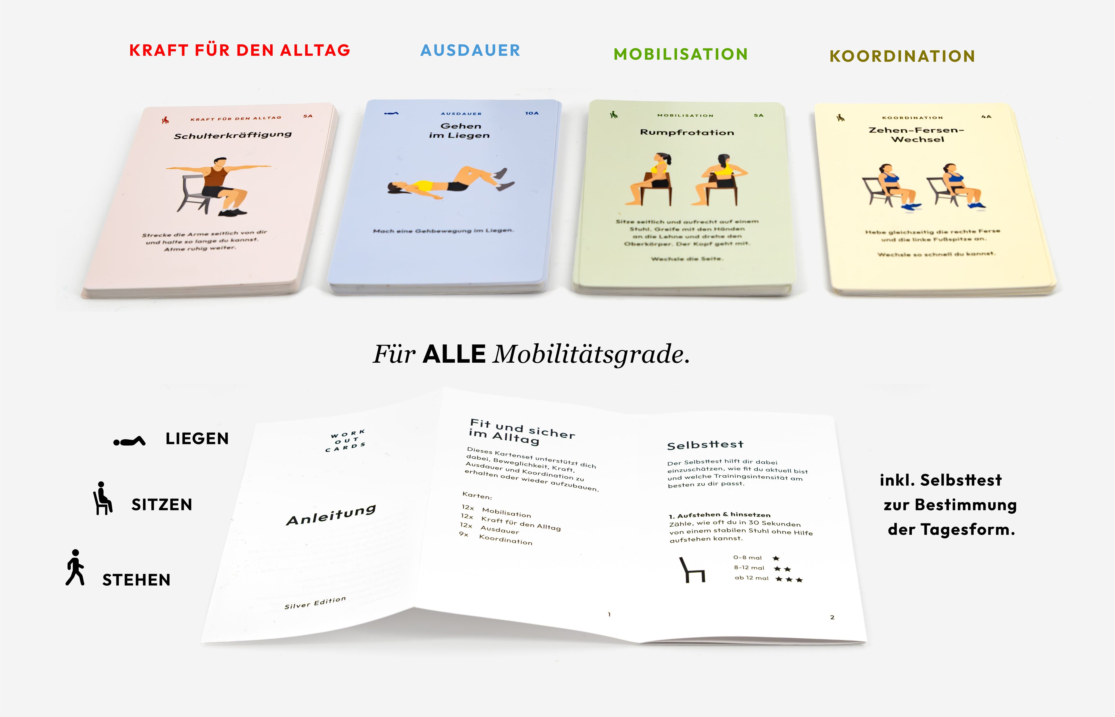 Die Karten sind leicht verständlich und führen dich Schritt für Schritt zu einer selbstständigen und regelmäßigen Routine. Du trainierst in deinem Tempo, angepasst an deine Tagesform.